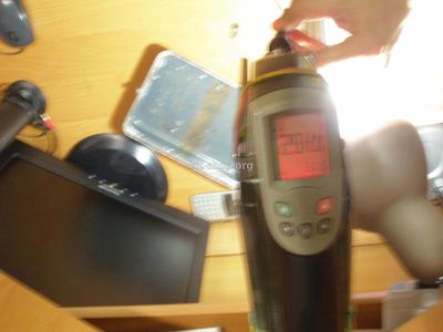 Казалось бы, многовато и я ошибся в расчетах. Но учитывая, то что сопротивление нихрома увеличивается при протекании через него электрического тока процентов эдак на 15, плюс недооткрытый симистор даже на максимальной мощности и ориентировочно получаем 60-65 Ватт. Первое включение решил провести без жала на минимальной мощности и замерять температуру нагревателя. На минимуме получилось 252 градусов, что довольно таки много. Тем более что на регуляторе и аннотации к товару указана минимальная температура 200 градусов. (Сори, за качество фото, но этот, якобы пирометр, еще та вещь).